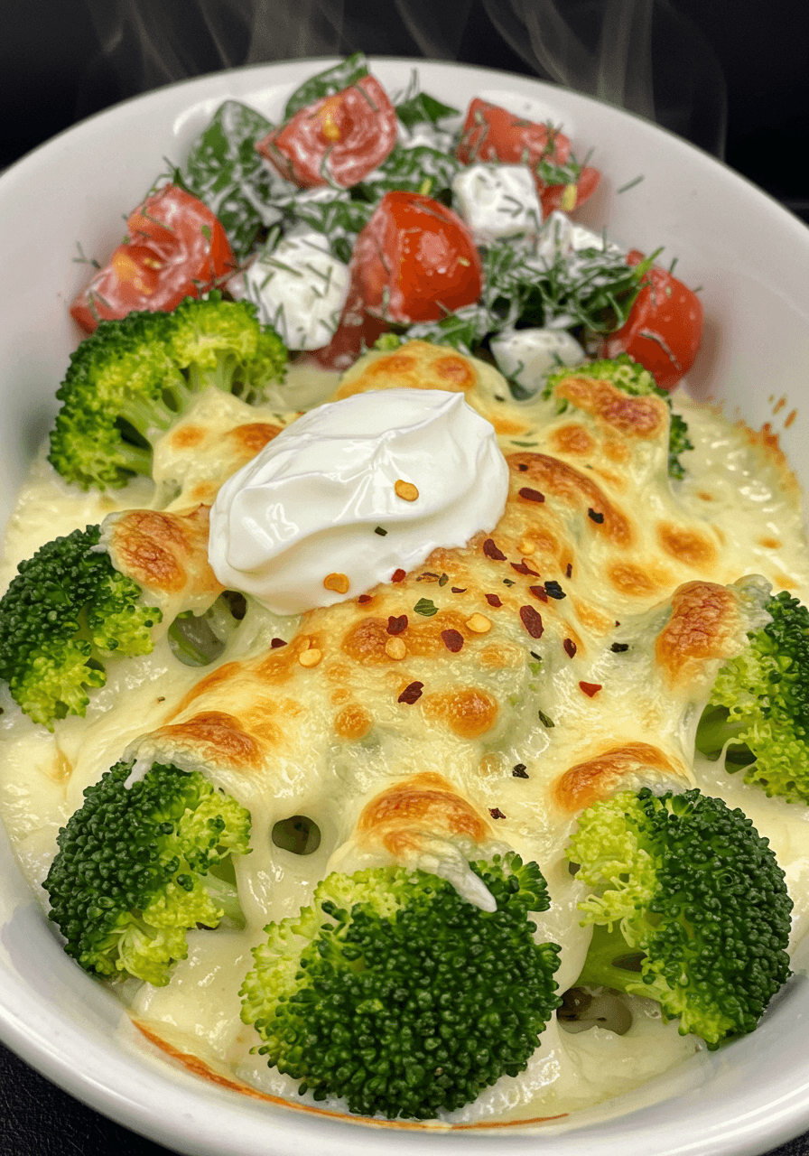 Deze Amerikaanse twist op een broccoli-kaasschotel combineert romige saus met knapperige groenten, perfect aangevuld met een frisse tomatensalade.
