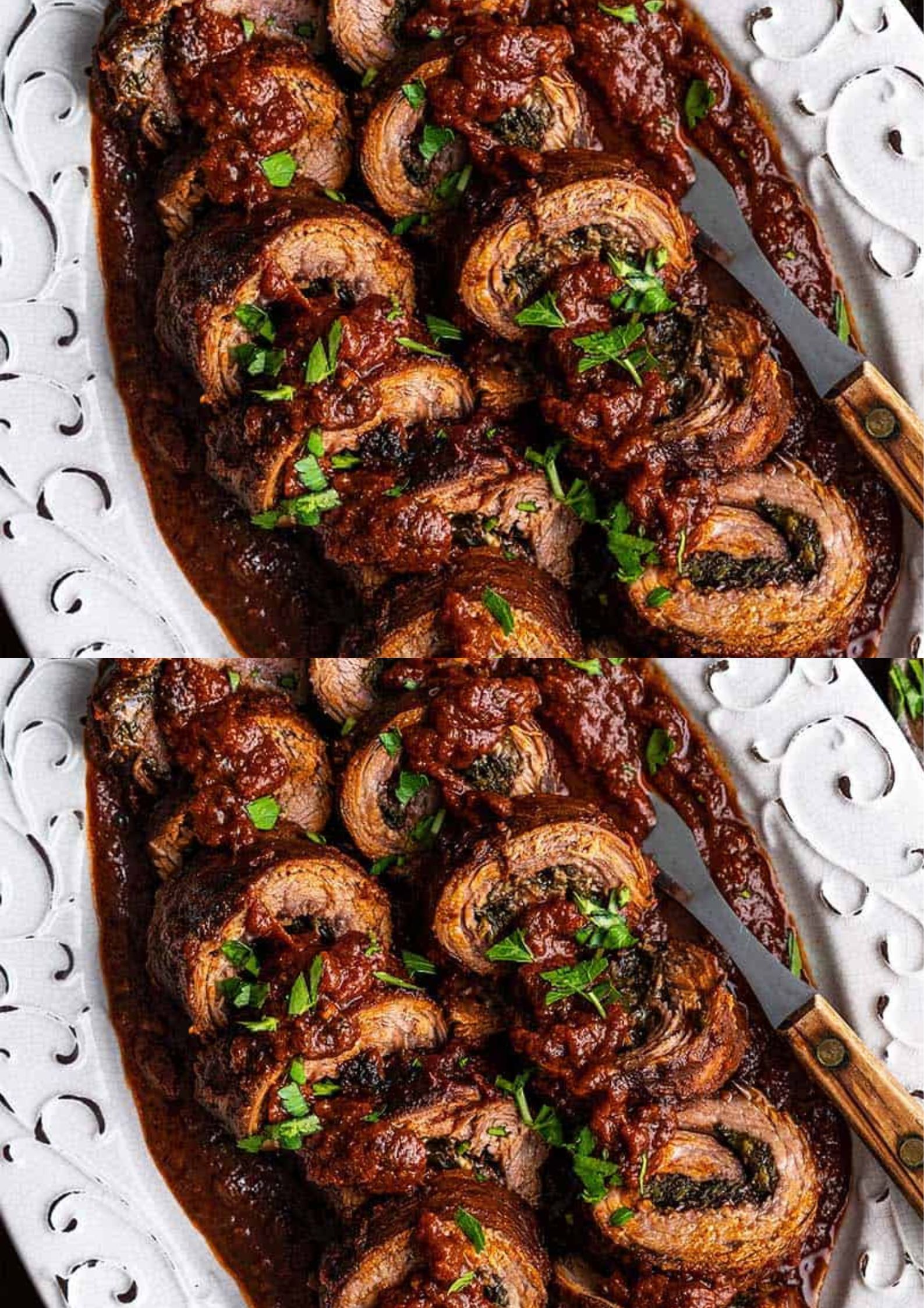 Dit indrukwekkende Italiaanse gerecht, ook bekend als Braciole, is een feestelijke rollade die generaties lang wordt geserveerd bij speciale gelegenheden. De combinatie van malse flank steak, spinazie en kaas, gesmoord in een rijke tomatensaus, maakt dit tot een waar meesterwerk.