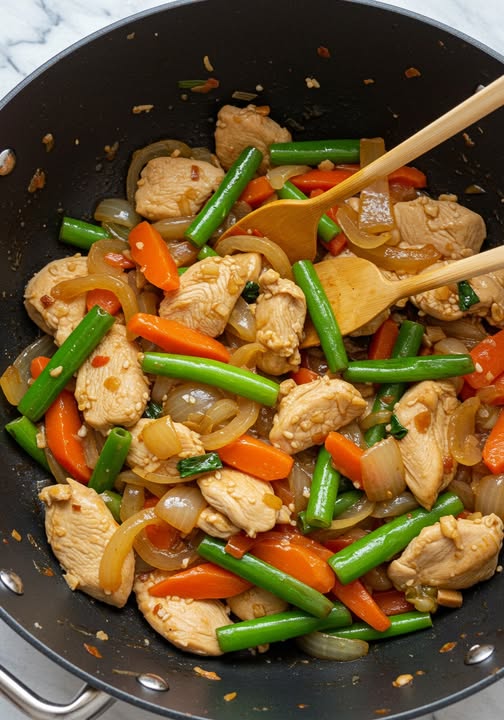 6. Voeg groenten toe, roerbak 5-7 minuten.