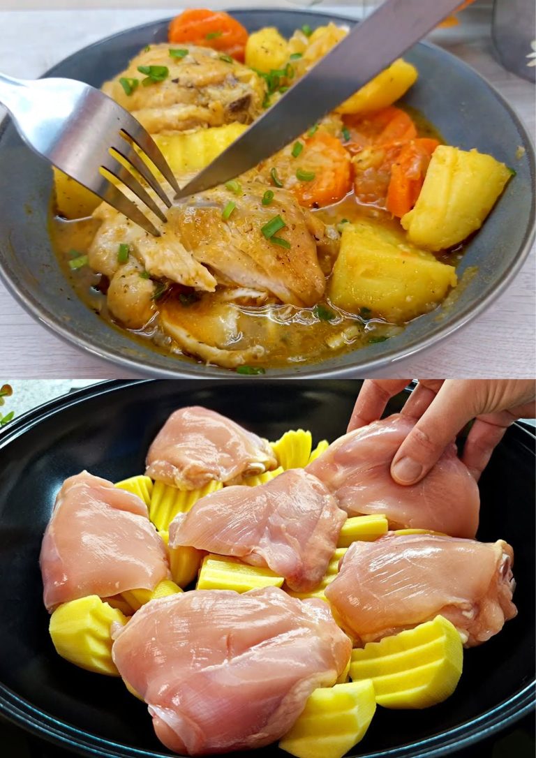 Dit verfijnde Franse gerecht combineert malse kip, gestoofd in rode wijn, met romige knoflookboteraardappelen. Een …