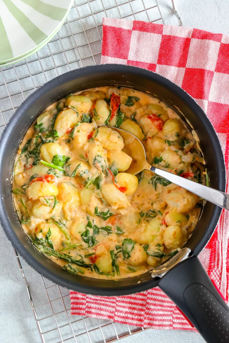 Romig eenpansgerecht met gnocchi, spinazie en cherrytomaten