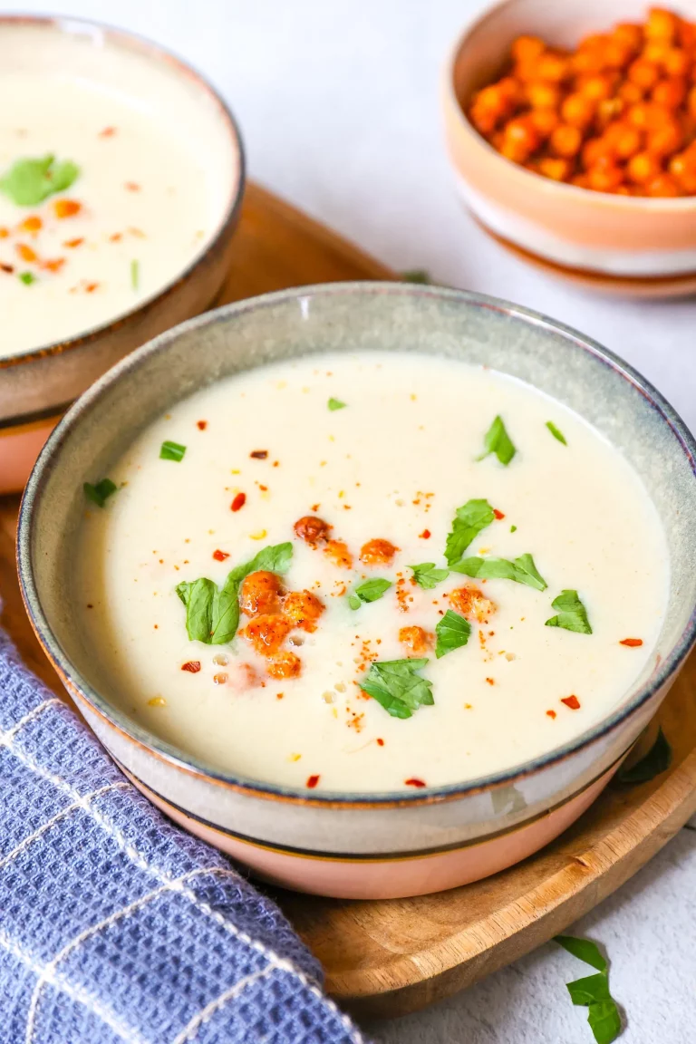 Deze romige bloemkoolsoep met kokosmelk en geroosterde kikkererwten is heerlijk zacht en vol van smaak. …