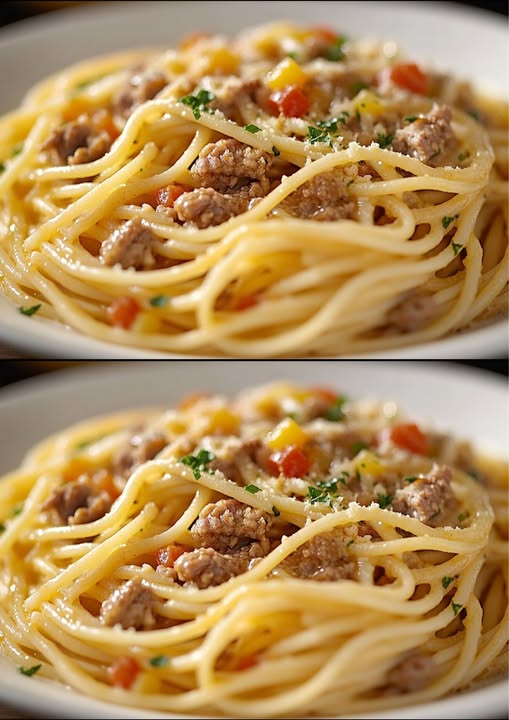 Bereid je voor op de ultieme one-pot pasta die je keuken verovert! Deze romige spaghetti combineert knapperig spek, mals rundergehakt en een fluweelzachte kaassaus in één pan. Geen gedoe met meerdere pannen, geen ingewikkelde stappen – gewoon pure smaak en gemak die je telkens opnieuw wilt maken.