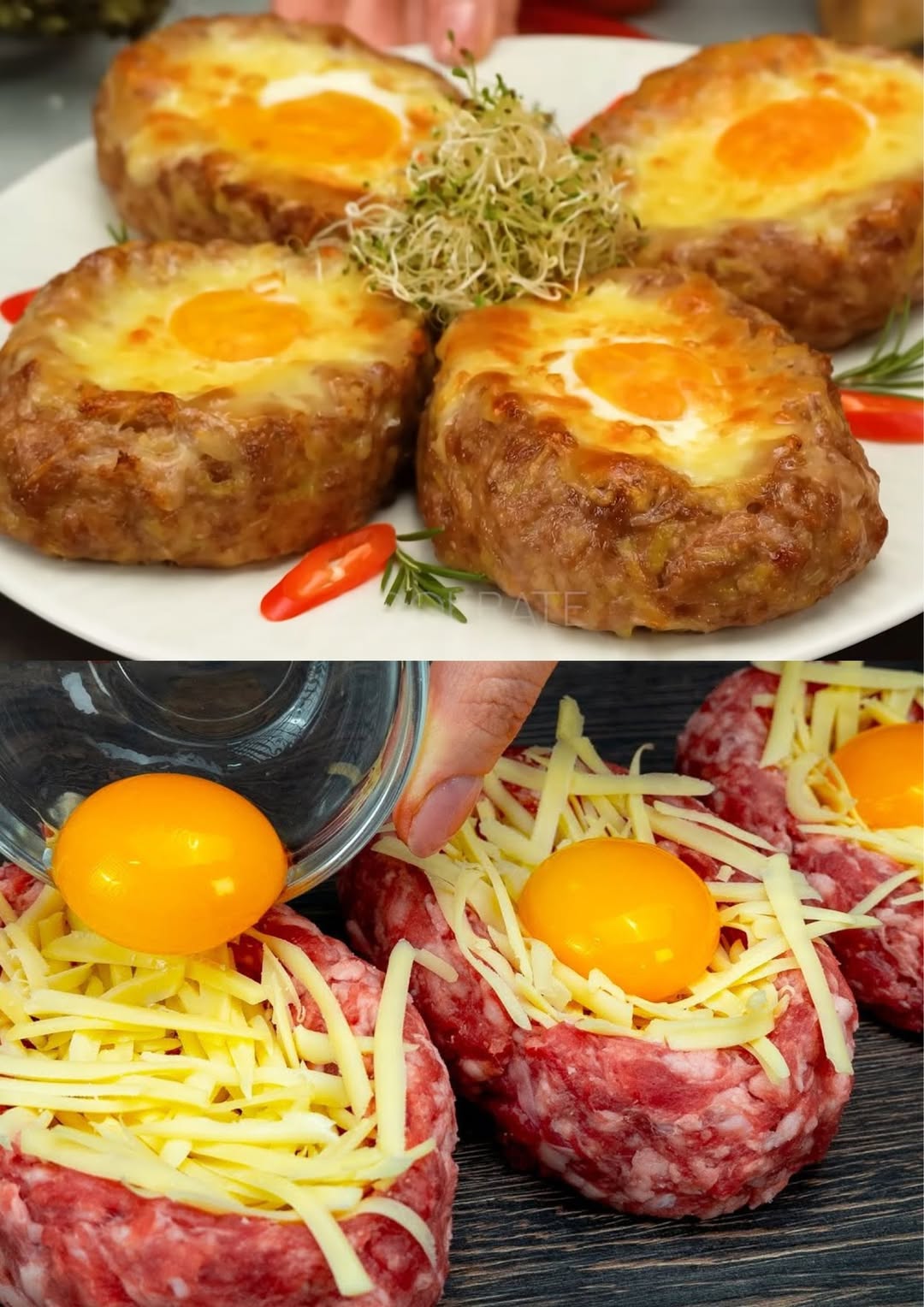 - Klop de 4 eieren los met 4 g zout en meng dit door de kaas. Strooi dit mengsel over het gehakt in de ovenschaal.
