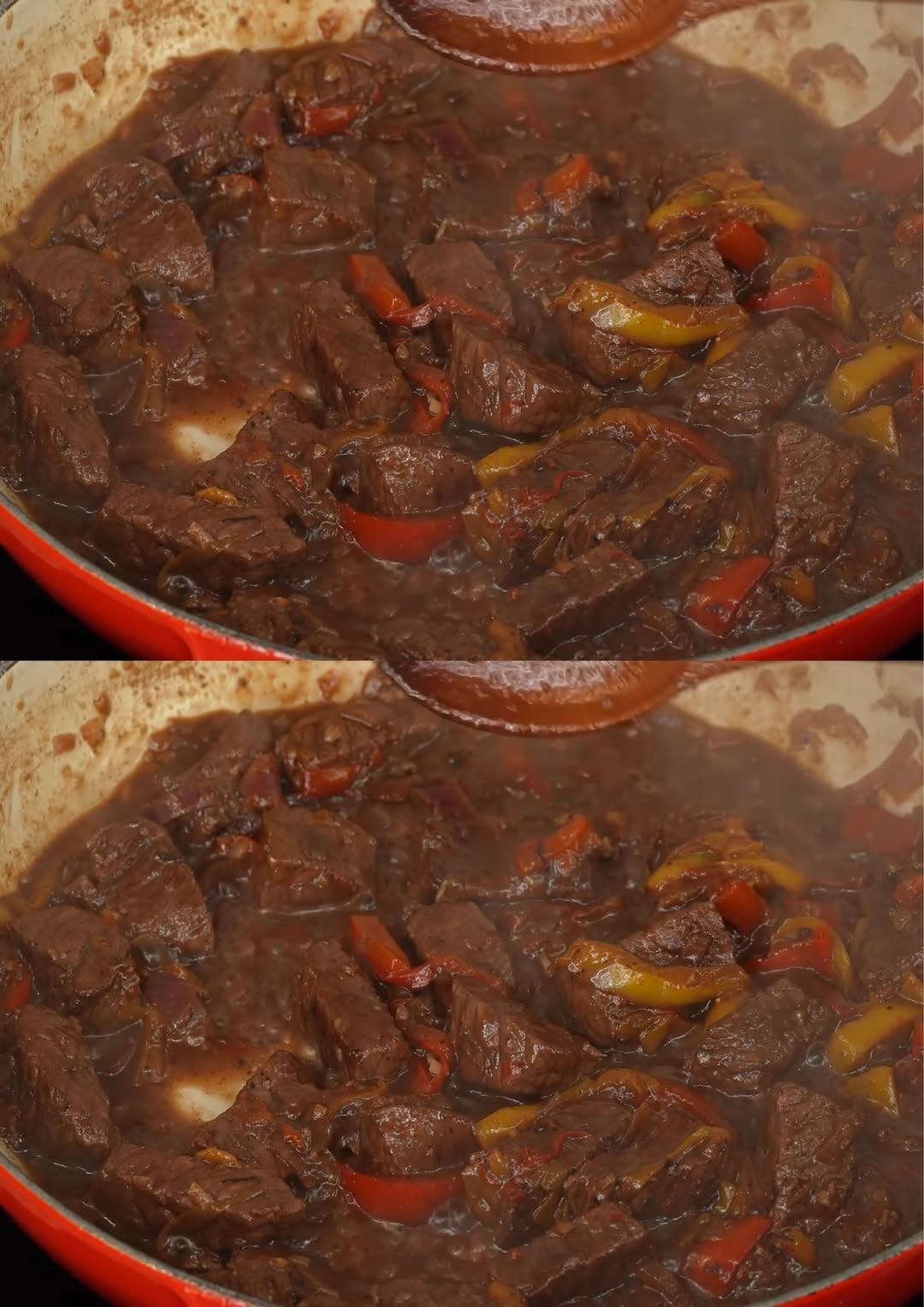 Voeg het rundvlees terug in de pan en zet het vuur laag. Doe het deksel op de pan en laat het vlees 10-12 minuten zachtjes sudderen, zodat het de smaken goed opneemt.