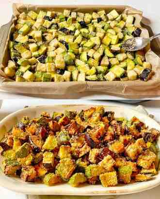 Kan ik de groenten van tevoren bereiden? Ja, paneer en bak ze tot 24 uur van tevoren. Verhit opnieuw in de oven voor optimale knapperigheid.