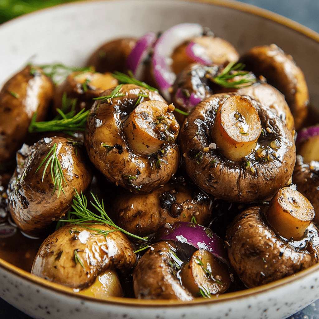 Deze gemarineerde champignons, geïnspireerd door Oost-Europese recepten, bieden een perfect evenwicht tussen zuur en umami. Het gerecht wordt traditioneel geserveerd als zakuska (voorgerecht) en is ideaal voor feestelijke gelegenheden.