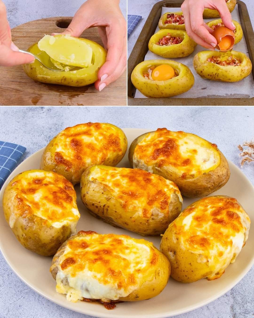 Kan ik dit gerecht van tevoren bereiden? Ja, u kunt de aardappelen uithollen en vullen, en ze afgedekt in de koelkast bewaren tot 24 uur voor het bakken.