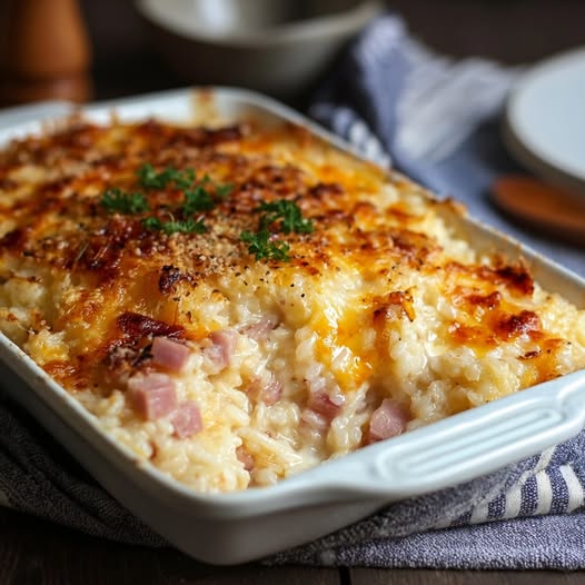 In de hartelijke keukens van Frans-landelijke gezinnen is de rijstgratin meer dan zomaar een maaltijd – het is een herinnering aan gezelligheid, warmte en eenvoudige culinaire perfectie. Dit gerecht verenigt de romigheid van bechamelsaus, de hartigheid van ham en de rijkdom van gesmolten kaas in één onweerstaanbare schotel.