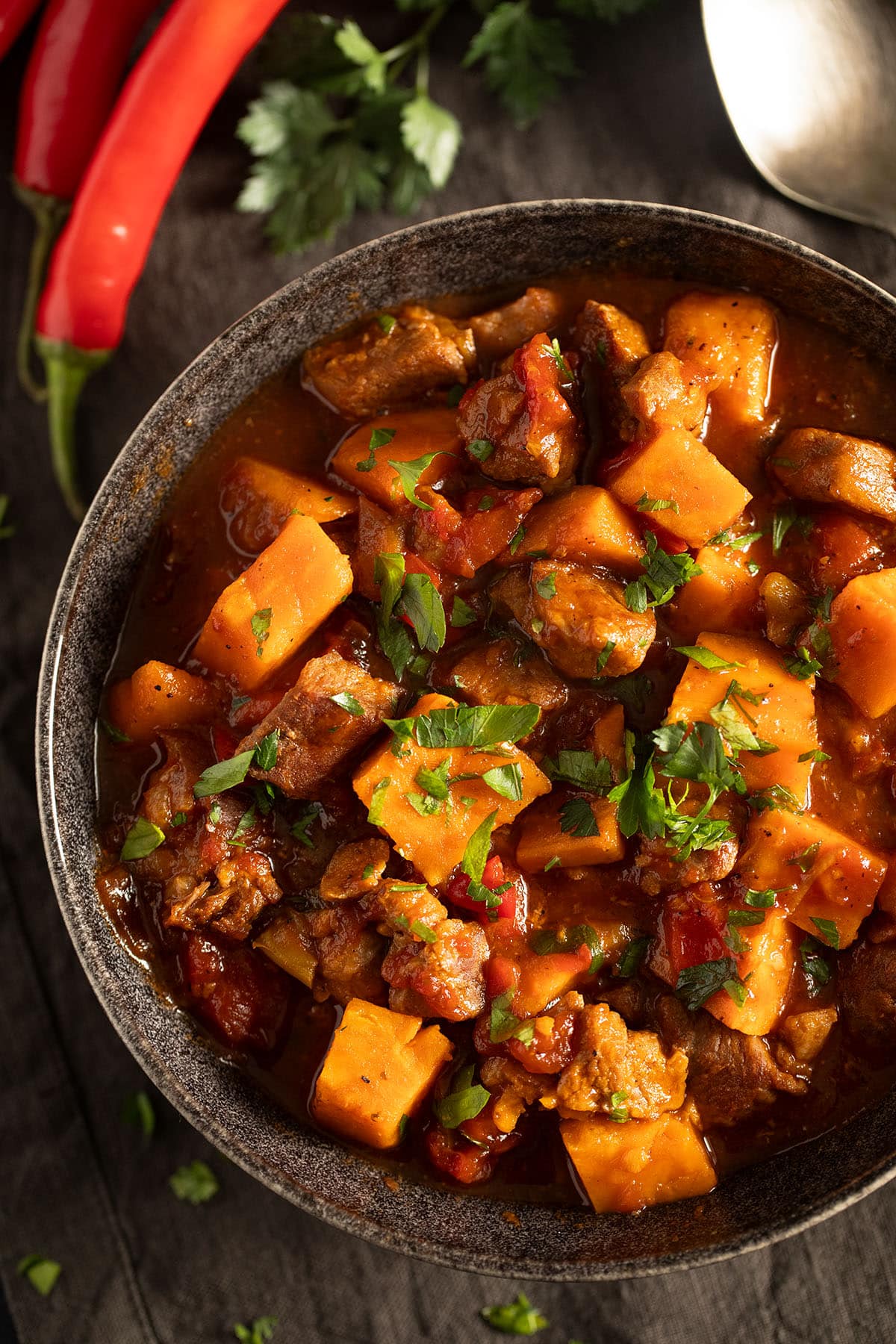 Deze hartige stoofpot is perfect voor koude dagen en wordt alleen maar beter als je hem een dag laat staan. De combinatie van mals varkensvlees en zoete aardappel zorgt voor een perfecte balans, terwijl de lange suddertijd alle smaken laat versmelten tot een rijk en troostrijk gerecht.
