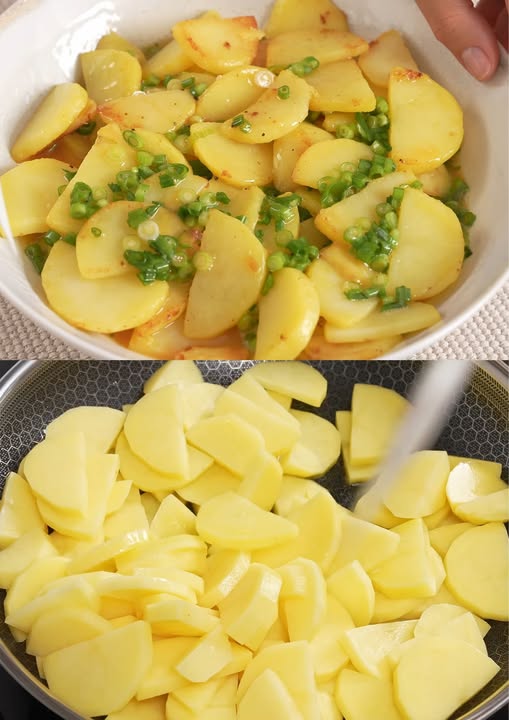- Bedek de bodem met de halfgare aardappelblokjes