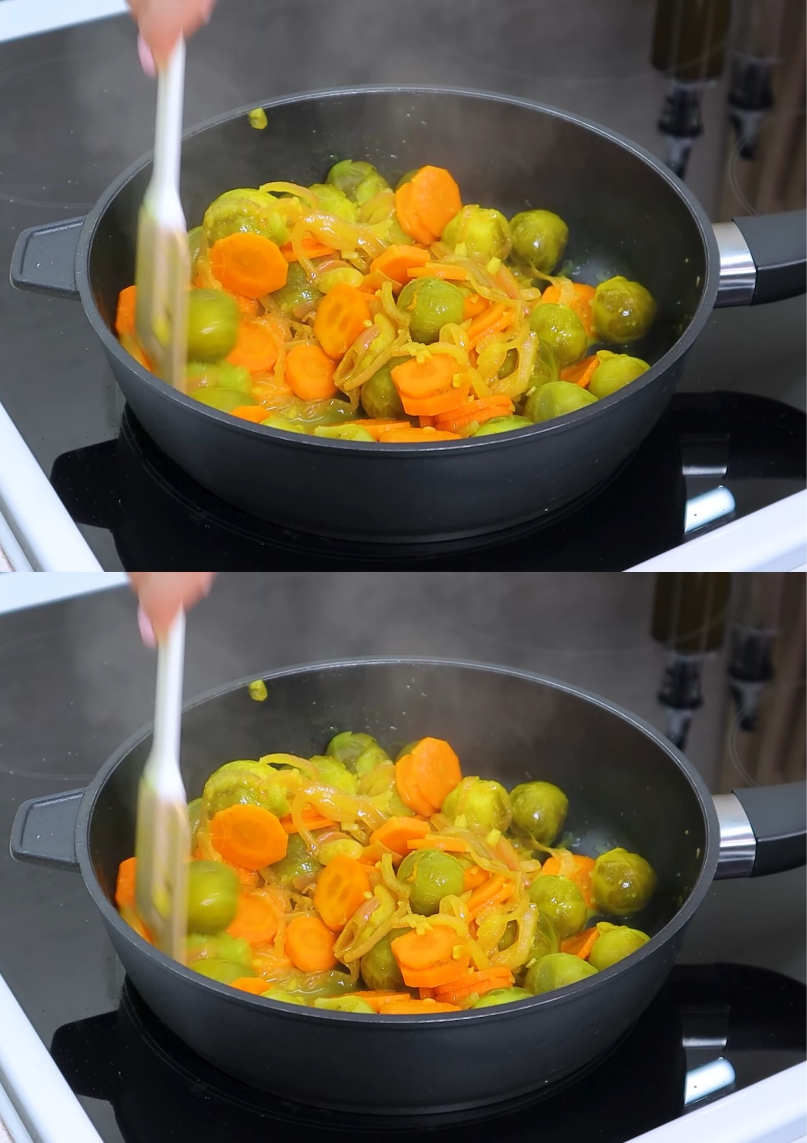- Dek de pan af en laat de groenten zachtjes stoven op laag vuur