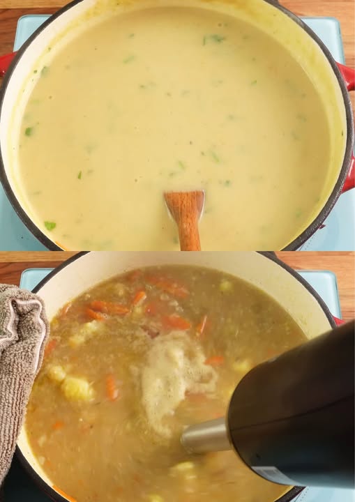 - Verwijder de pan van het vuur en mix de soep glad met een staafmixer.