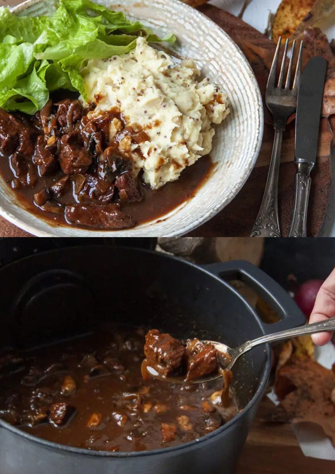 Deze verfijnde stoofschotel verenigt de rijke traditie van Nederlands bockbier met seizoensgebonden paddenstoelen. Het gerecht belichaamt de essentie van de Nederlandse herfstgastronomie, waarbij het donkere seizoensbier en de aardse smaken van champignons samenkomen in een troostrijke maaltijd.