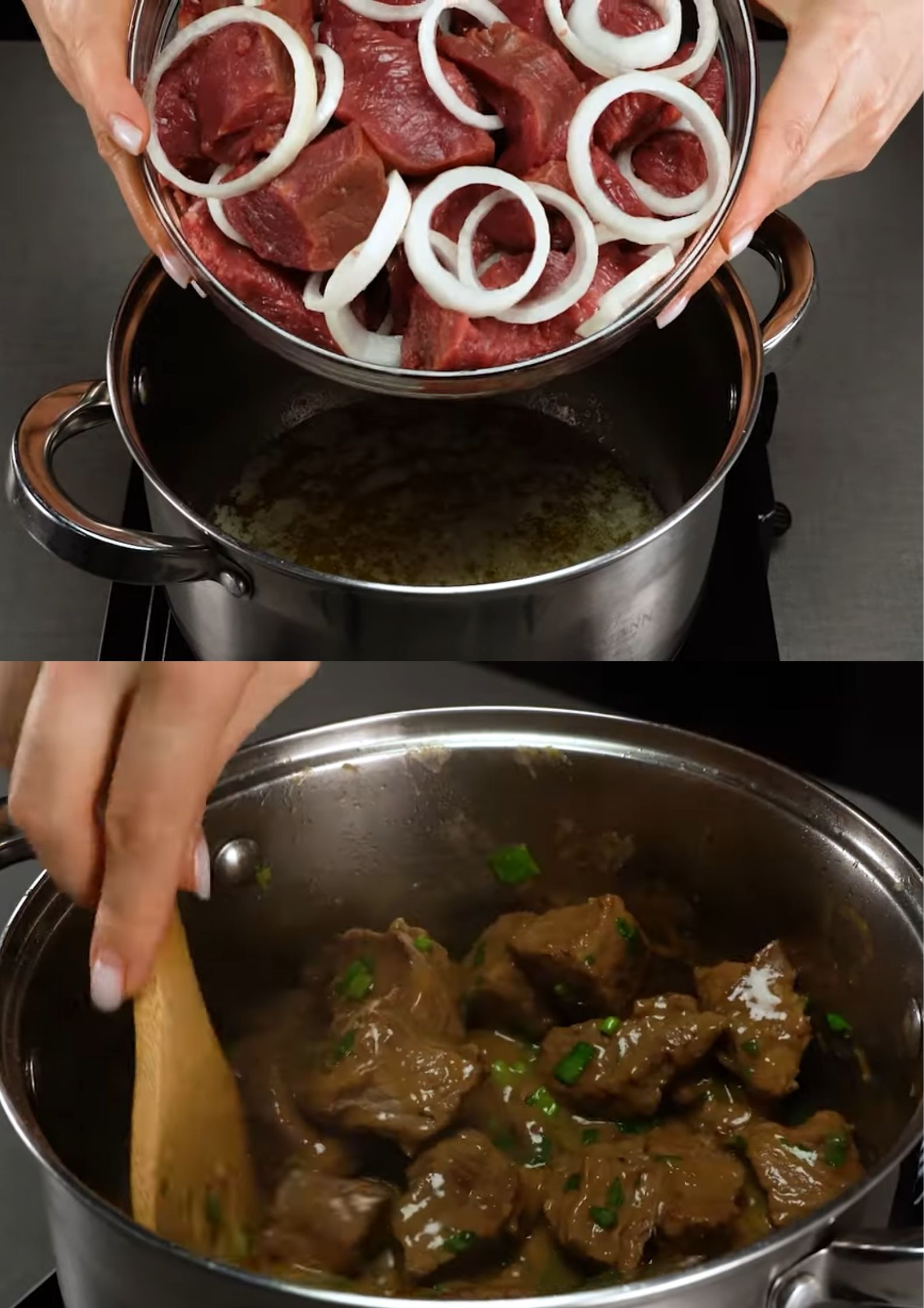 - Snijd het rundvlees in gelijke stukken van ongeveer 4-5 cm