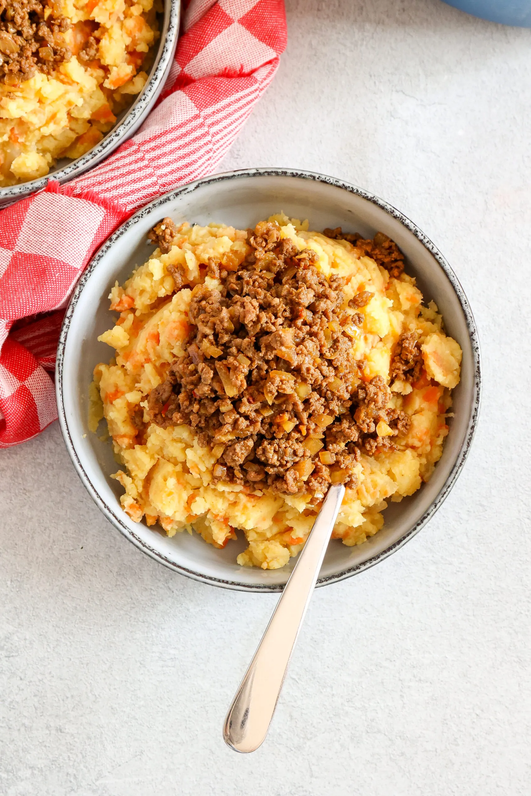- Serveer de Indische hutspot op een bord en schep het kruidige gehakt erbovenop.