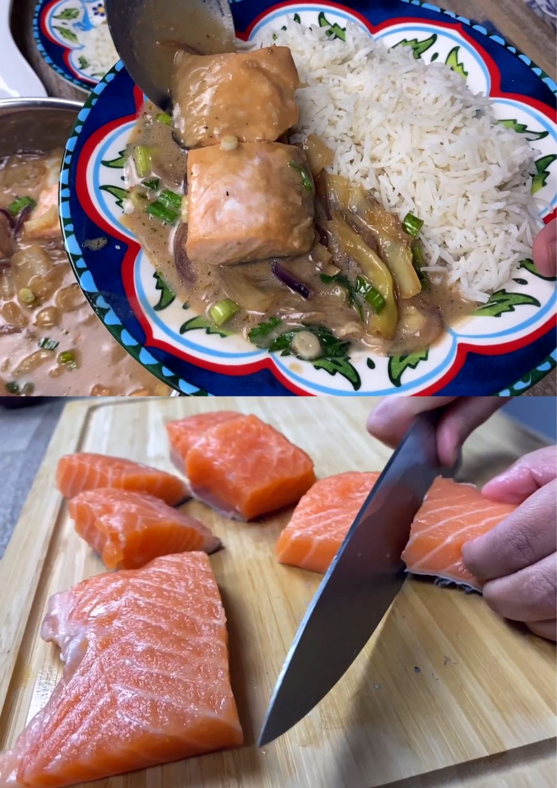 Dit gerecht combineert de rijke smaak van zalm met de umami van miso en de romigheid van kokosmelk. Het is een perfecte balans van Japanse en Zuidoost-Aziatische smaken, waarbij de zalm zacht wordt gestoofd in een aromatische bouillon.