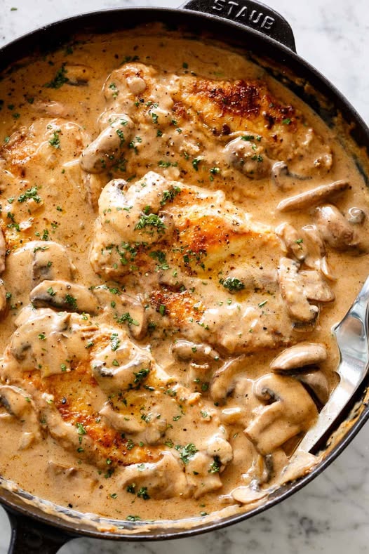 De combinatie van malse kipfilet met een romige, hartige saus vol champignons en ui creëert een gerecht dat zowel troostrijk als verfijnd is. De diepte van de smaak komt van de perfecte mix van kruiden, Dijon-mosterd en een vleugje witte wijn, die samen een onweerstaanbare saus vormen die geweldig goed past over noedels, rijst of aardappelpuree.