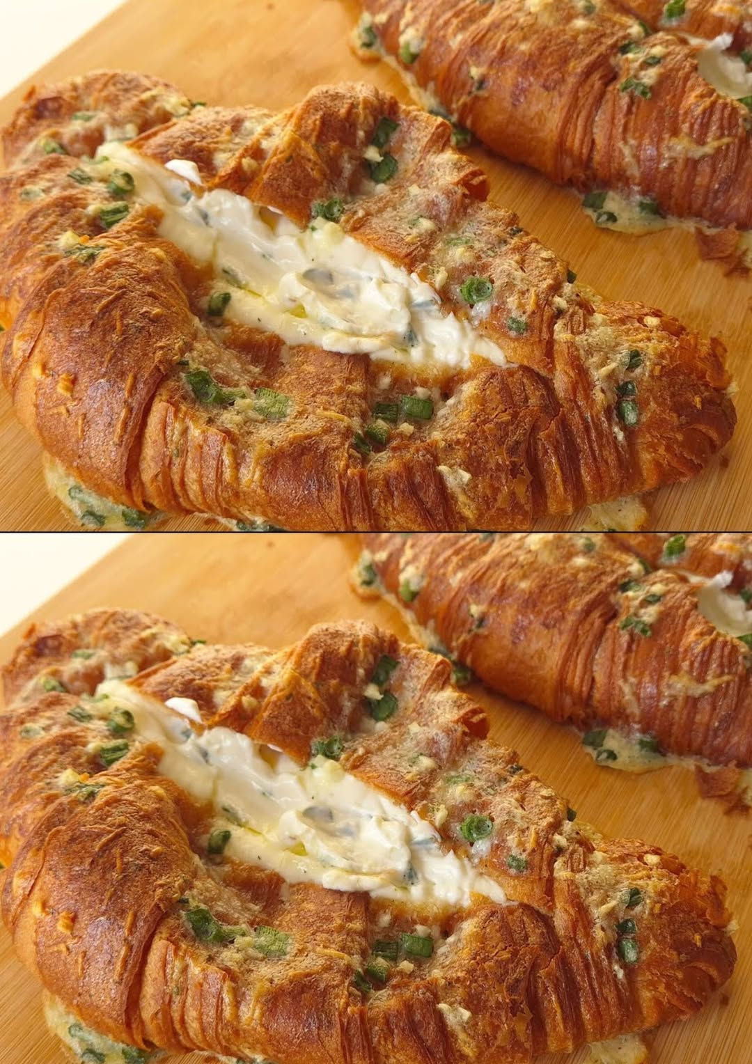 Elke hap is een verhaal van contrasterende texturen en gelaagde smaken. Van de knapperige buitenkant tot de romige, knoflookrijke vulling – dit recept transformeert een gewone croissant in iets buitengewoons.