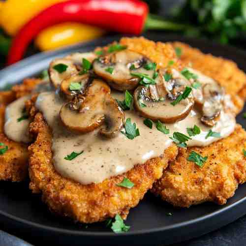 Geïnspireerd door de rijke Europese keuken, verenigt dit recept de knapperige techniek van schnitzel met de verfijnde smaak van een klassieke champignonsaus. Een gerecht dat comfort en elegantie perfect balanceert.