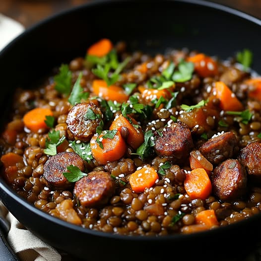 - Vegetarische versie: vervang worst door plantaardige worst of extra linzen.