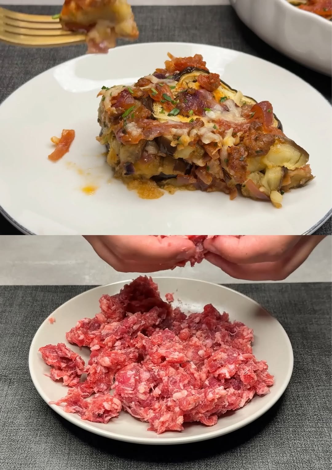 - Maak lagen: aubergines, worst-ui mengsel, geraspte kaas