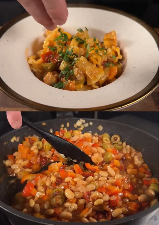 Stap 3: Groenten bakken Voeg in dezelfde pan de gesnipperde ui toe en bak 2 minuten glazig. Voeg de geperste knoflook, paprikareepjes, zongedroogde tomaten en olijven toe. Bak 3 minuten mee tot de paprika’s zacht beginnen te worden.