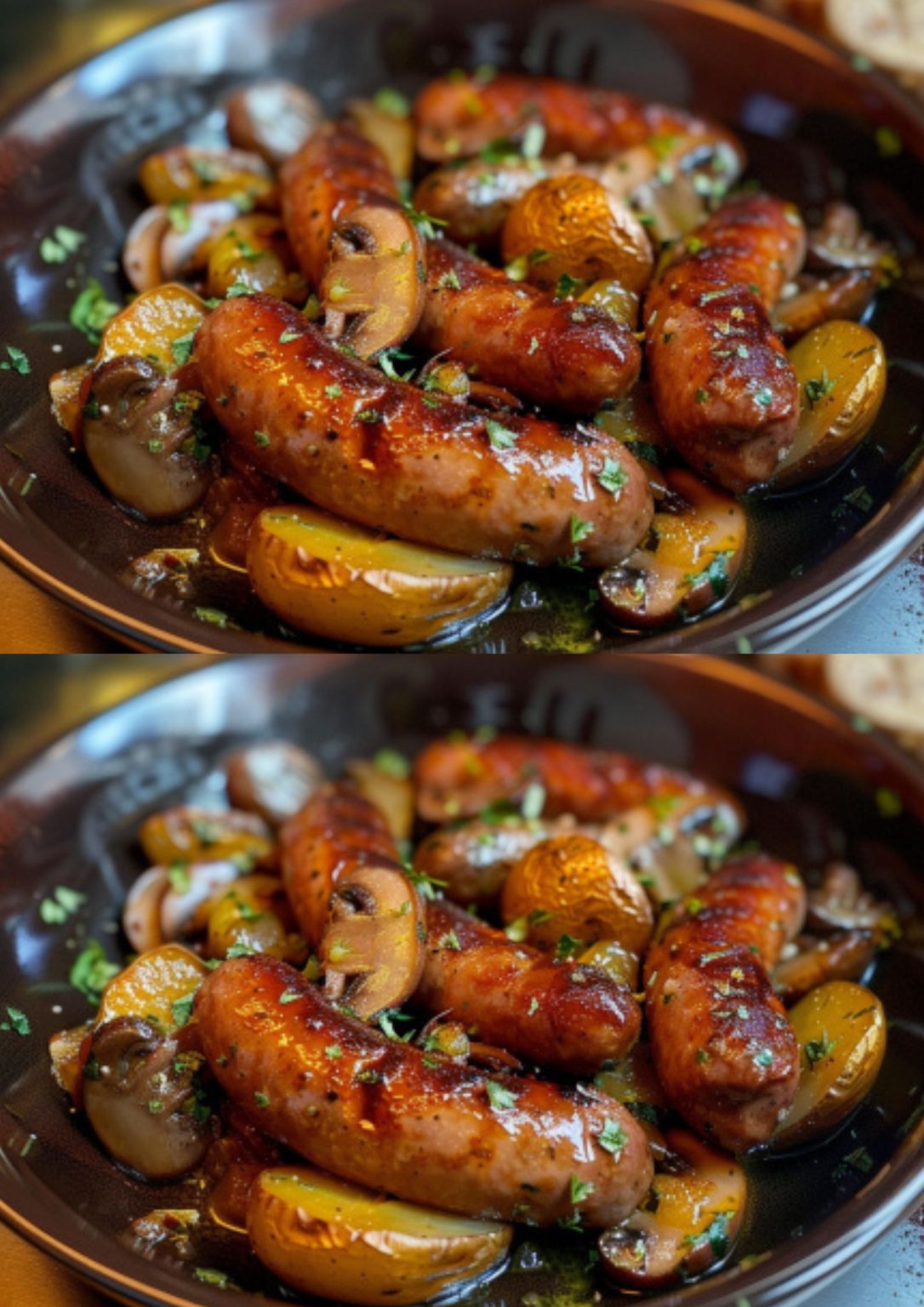 Deze klassieke ovenschotel combineert sappige worsten met knapperige aardappelen en aardse champignons in een harmonieus geheel. Het gerecht, geïnspireerd door traditionele Europese keuken, biedt een perfecte balans tussen comfort en verfijning, waarbij elk ingrediënt zijn eigen karakteristieke smaak behoudt terwijl ze samen een coherent geheel vormen.