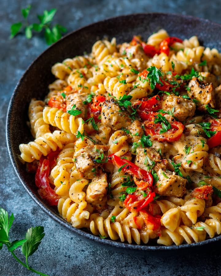 Deze romige pasta met kip levert eiwitten uit de kip en een zijdezachte saus van kruidenkaas, voor een bevredigende maaltijd die snel energie geeft. De verse kruiden en knoflook voegen smaak toe zonder overbodige calorieën – ideaal voor een evenwichtige doordeweekse dinner!