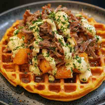 In de wereld van verfijnde gerechten staat deze combinatie van zoete aardappelwafels, malse eendenconfit en romige groene pepersaus synoniem voor culinaire innovatie. Een gerecht dat de grenzen verlegt tussen traditionele keuken en moderne culinaire kunst, waarbij elke component zorgvuldig is geselecteerd om een harmonieus smaakpalet te creëren.