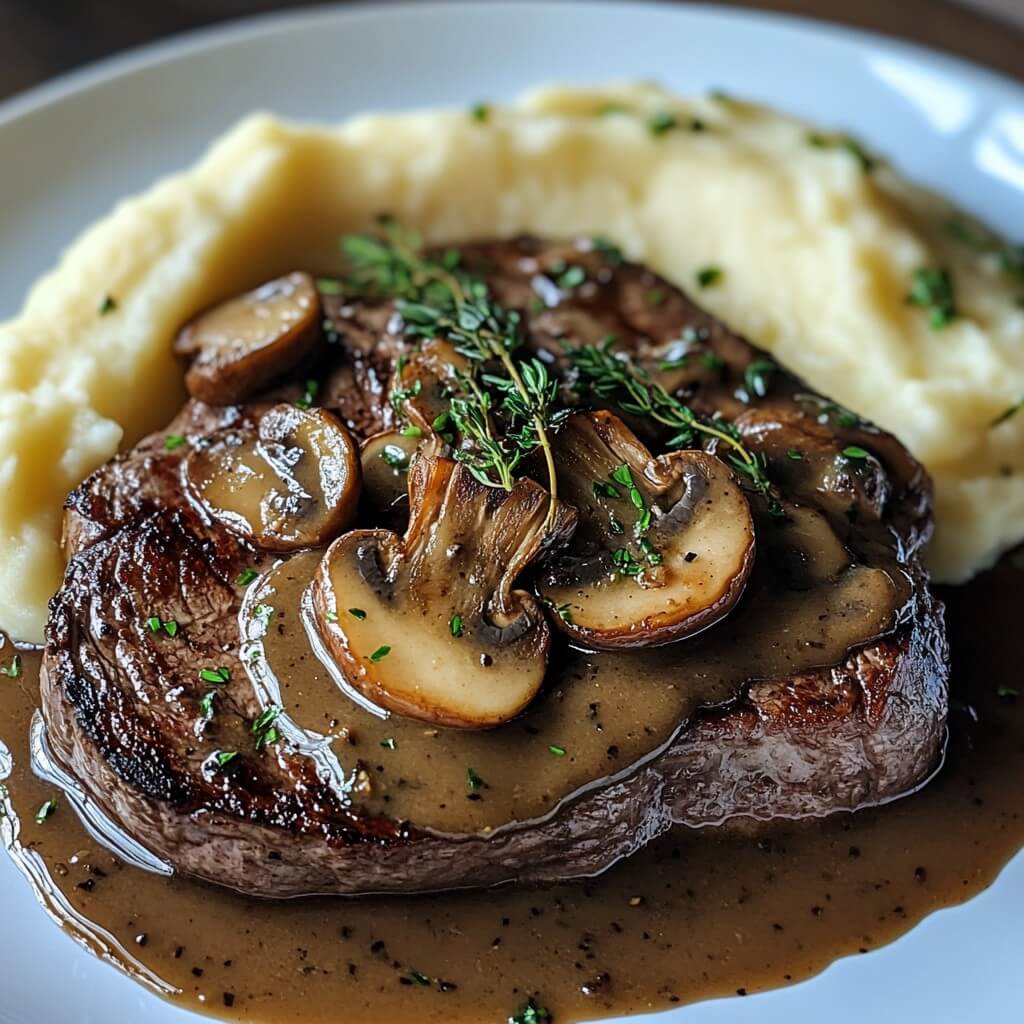Een ribeye steak is meer dan zomaar een stuk vlees – het is een culinaire ervaring die de zintuigen prikkelt en de essentie van goed eten verpersoonlijkt. Deze klassieker combineert de robuste smaak van perfect gebraden rundvlees met een rijke champignonsaus en romige aardappelpuree, een gerecht dat rechtstreeks lijkt te komen uit een verfijnde steakhouse.