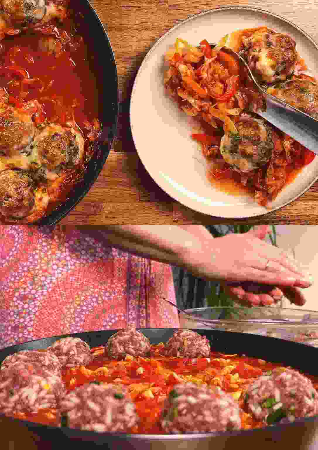 - Verdeel het gehakt-rijst-koolmengsel in een grote ovenschaal.
