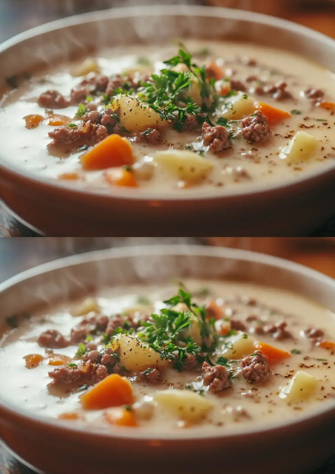 Deze hartverwarmende soep combineert malse aardappelen met smaakvol gehakt in een romige kaassaus voor de perfecte wintermaaltijd.