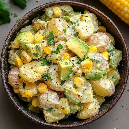Ontdek de perfecte combinatie van romige aardappelen, romige avocado en zoete maïs in deze heerlijke salade. Een lichte en verrassende maaltijd die zowel gezond als verrukkelijk is, ideaal voor zomerse lunches of als bijgerecht bij je favoriete gerechten.