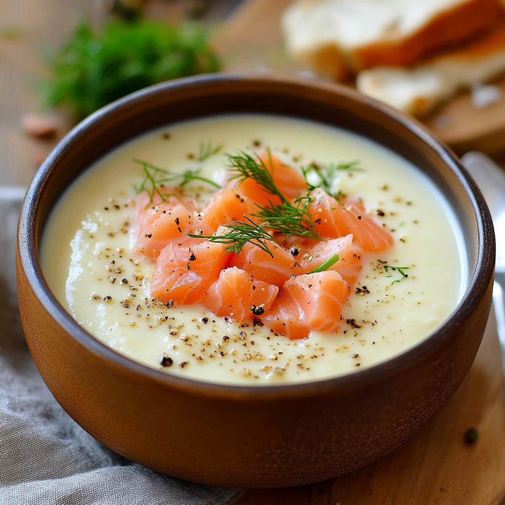 In de wereld van culinaire verfijning staat deze bloemkoolsoep met gerookte zalm synoniem voor elegantie en smaakbeleving. Het gerecht verenigt de zachte, romige textuur van bloemkool met de intense, rokerige rijkdom van gerookte zalm – een combinatie die zowel troostend als verfijnd is.