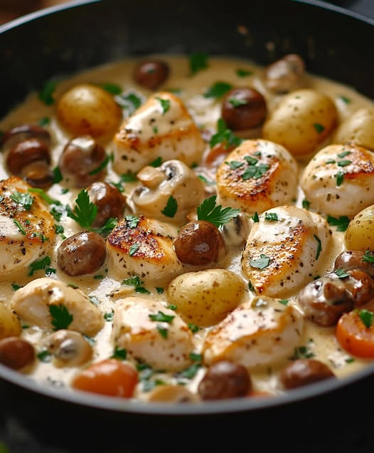 Dit recept is een geweldige combinatie van romige texturen en rijke smaken, perfect voor een doordeweekse avondmaaltijd die eruitziet alsof hij uit een restaurant komt. Het combineert de zachte textuur van kip met de aardse smaak van champignons in een romige saus.