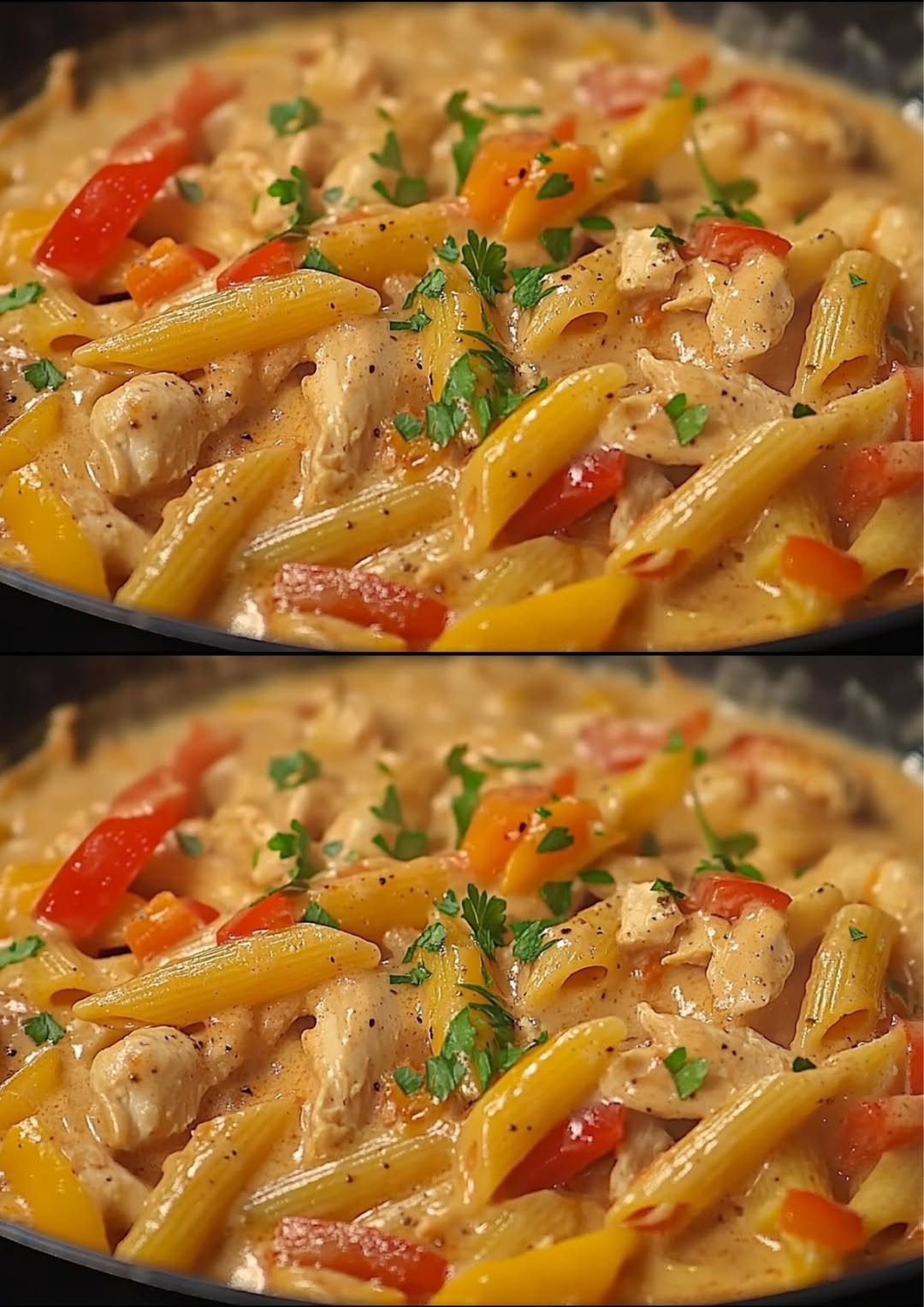 Dit gerecht combineert de zachte smaak van kip met de rijkdom van een romige saus en de zoete tonen van gekleurde paprika’s.