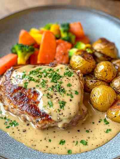 - Serveer de kip met de romige saus en gestoomde groenten.