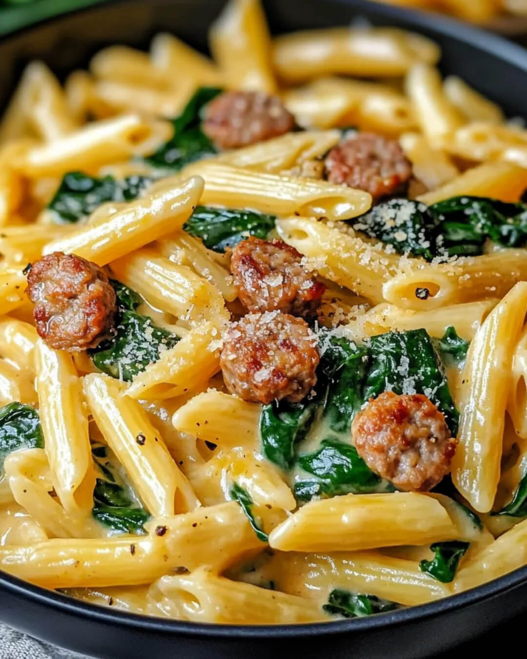 Romige Penne met Spinazie en Italiaanse Worst: Een Culinaire Smaakexplosie in Één Pan