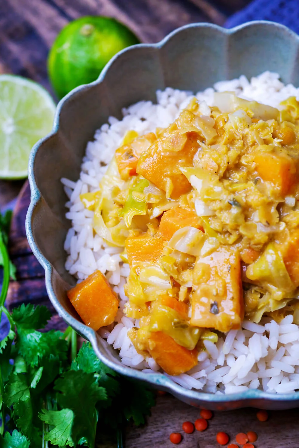 Een zachte, romige curry waarin de milde smaak van spitskool wordt verrijkt met zoete aardappel en rode linzen. De kokosmelk zorgt voor een romige basis, terwijl de currypasta zorgt voor een warme, kruidige diepgang.