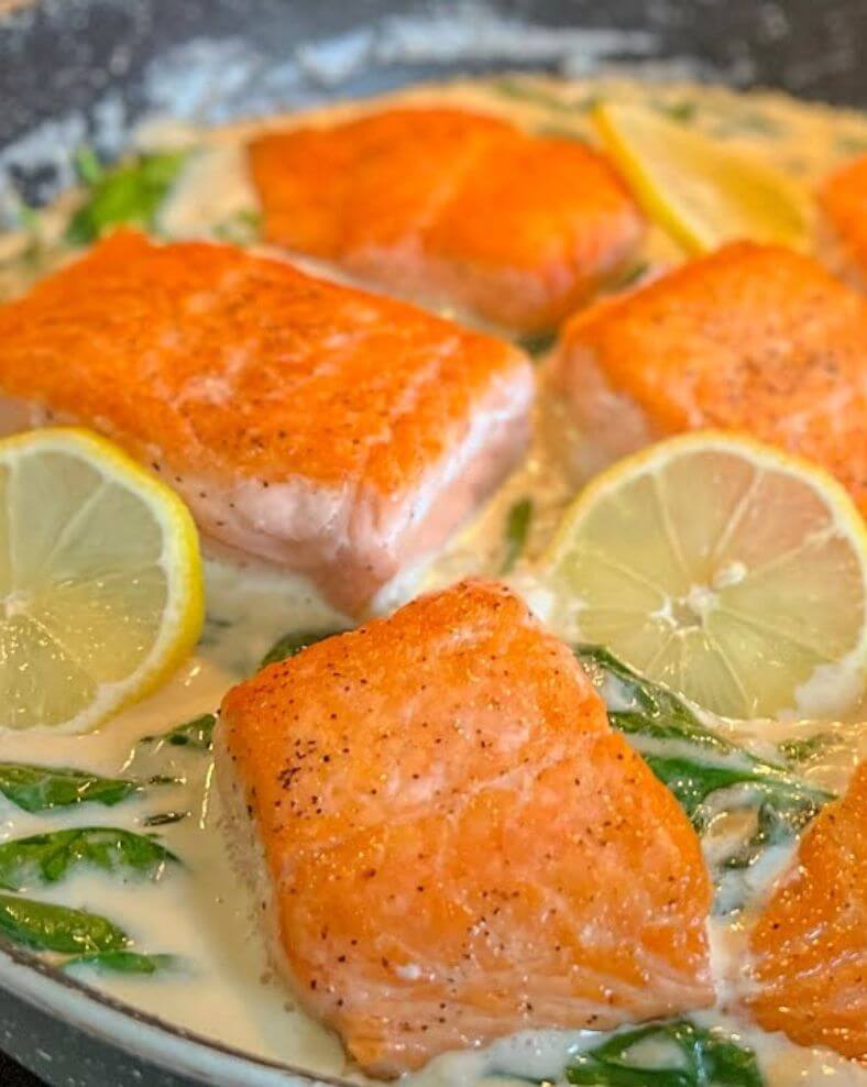 Zalm, rijk aan omega-3 vetzuren en van nature smaakvol, vormt het hart van dit gerecht. De zachte, romige saus met Parmezaanse kaas omhult de vis en geeft een luxueuze textuur, terwijl de verse spinazie een aards en voedzaam element toevoegt.