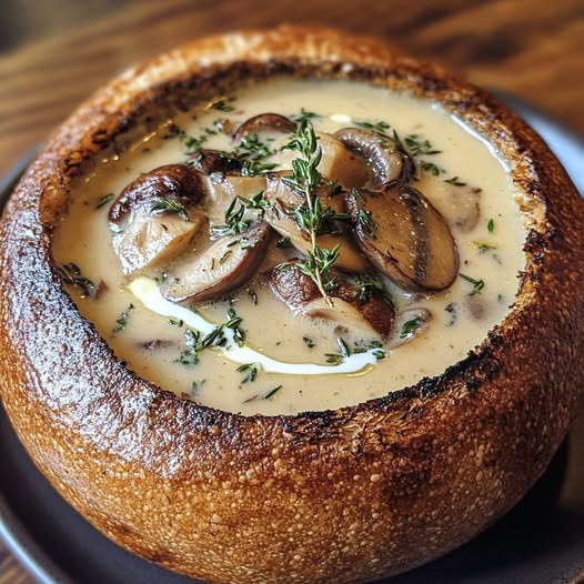 In de groene bossen van Frankrijk, waar paddenstoelen tussen de oude boomstammen groeien, vindt men de inspiratie voor gerechten die pure gastronomische magie belichamen. Dit soepbrood is een eerbetoon aan de rijke aardse smaken van wilde champignons en de subtiele aromaten van verse tijm.