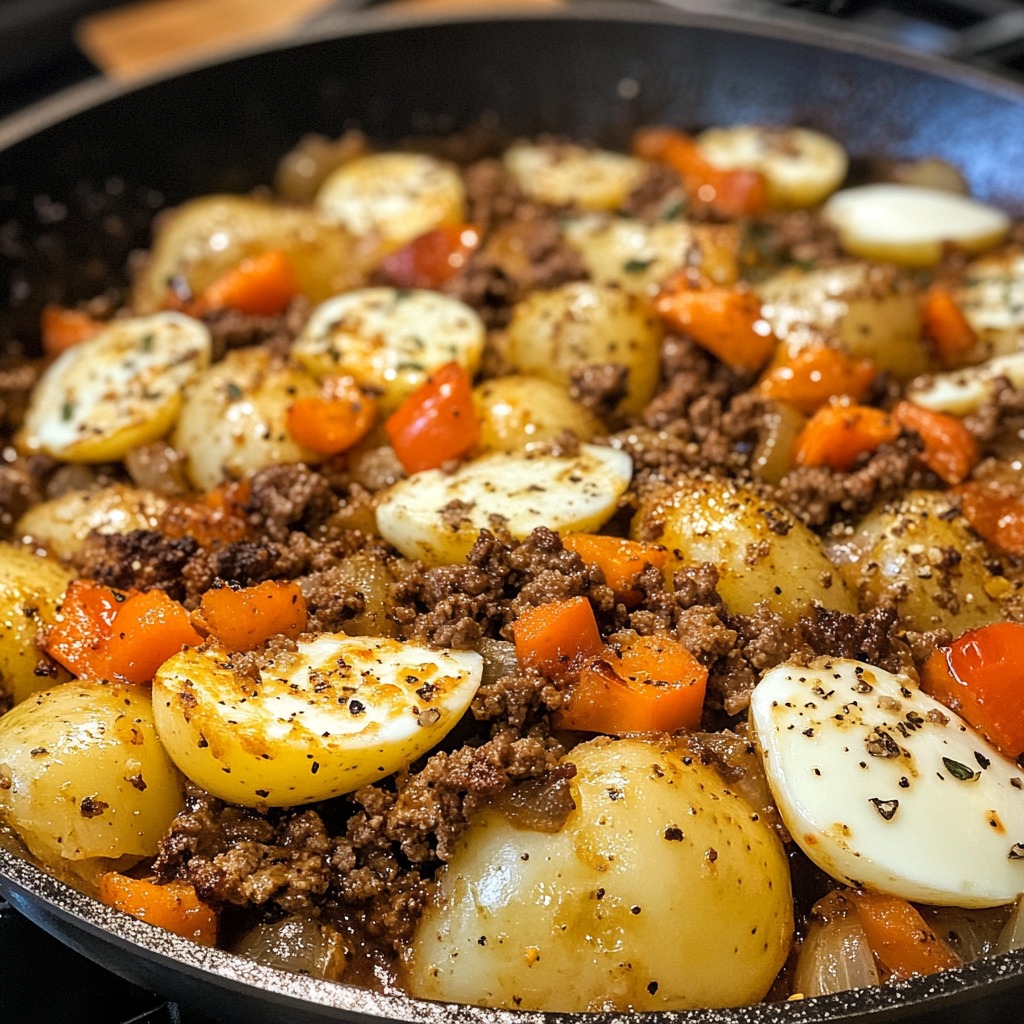 - Verdeel het gebakken gehakt gelijkmatig over de aardappelen.