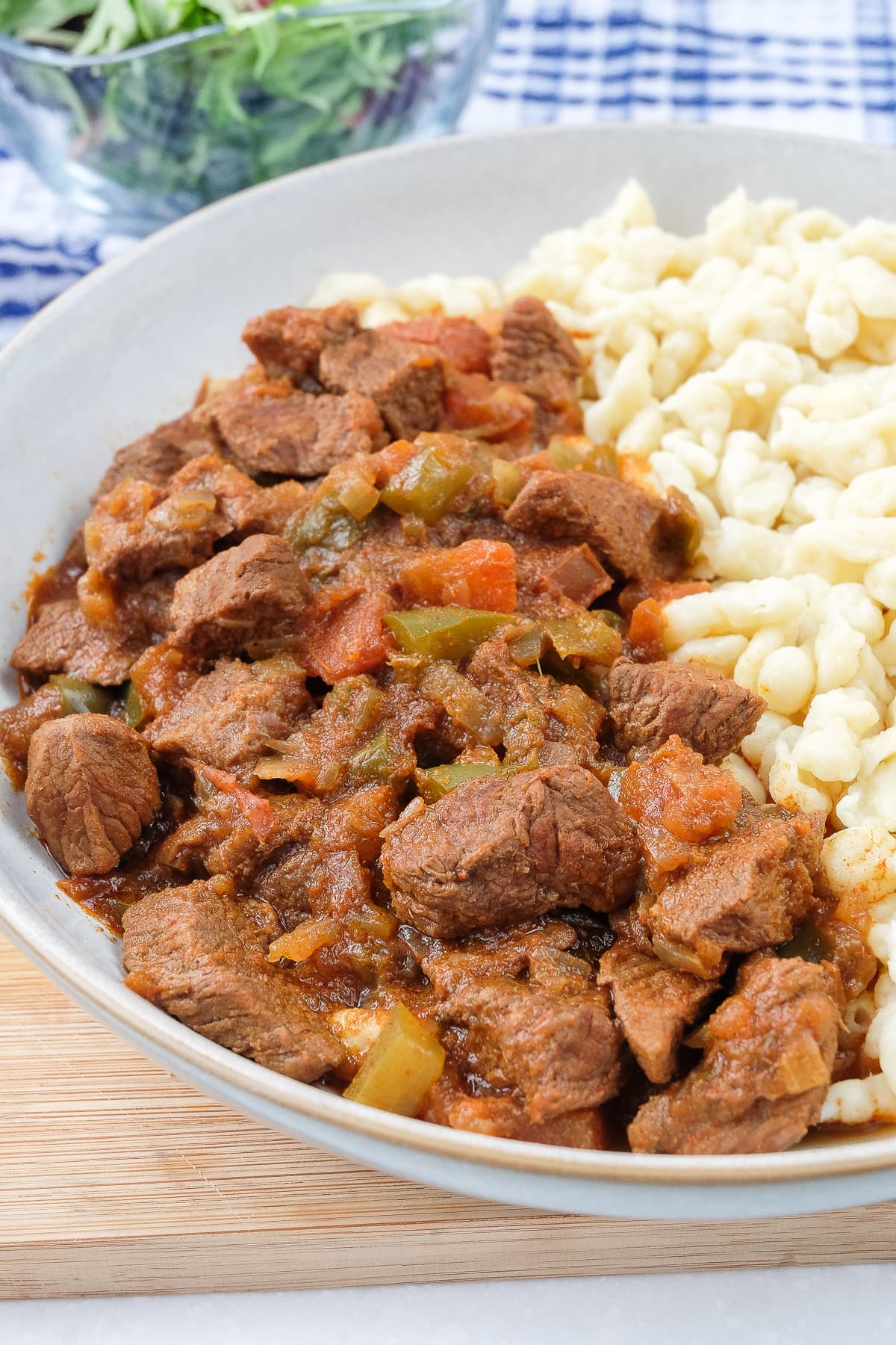 Deze hartige stoofpot is traditioneel het hart van de Hongaarse familiekeuken. Geserveerd met noedels (csipetke) of aardappelen vormt het een complete maaltijd die de essentie van de Hongaarse kookkunst belichaamt.