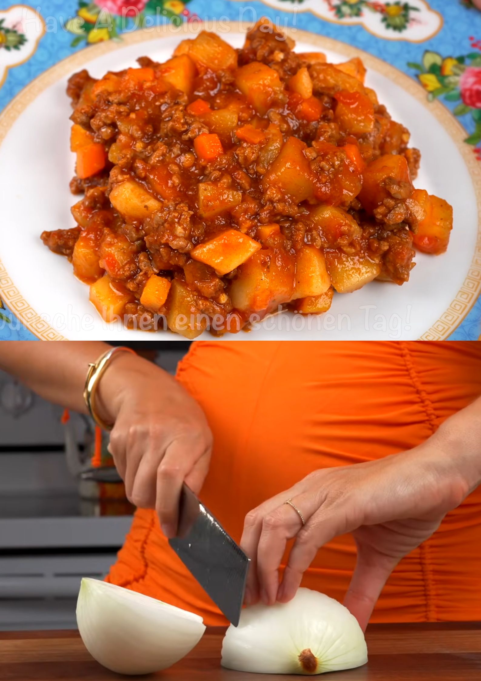 Deze hartverwarmende stoofschotel combineert sappig rundergehakt met aardappelen en seizoensgroenten in een rijke tomatensaus, perfect voor een feestelijk kerstdiner.