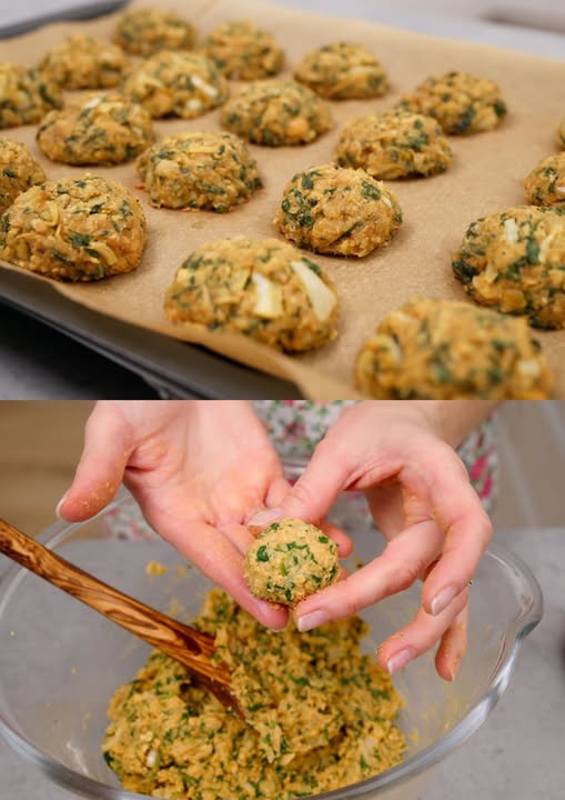- Neem kleine porties van het mengsel (ongeveer een eetlepel per balletje) en rol ze tussen je handpalmen tot balletjes.