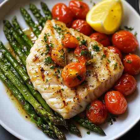 Dit gerecht is een ode aan de subtiele smaken van de zee en het land. Door de combinatie van malse witte vis, aromatische knoflookboter, knapperige asperges en zoete cherrytomaatjes creëren we een maaltijd die zowel verfijnd als verrassend eenvoudig is.
