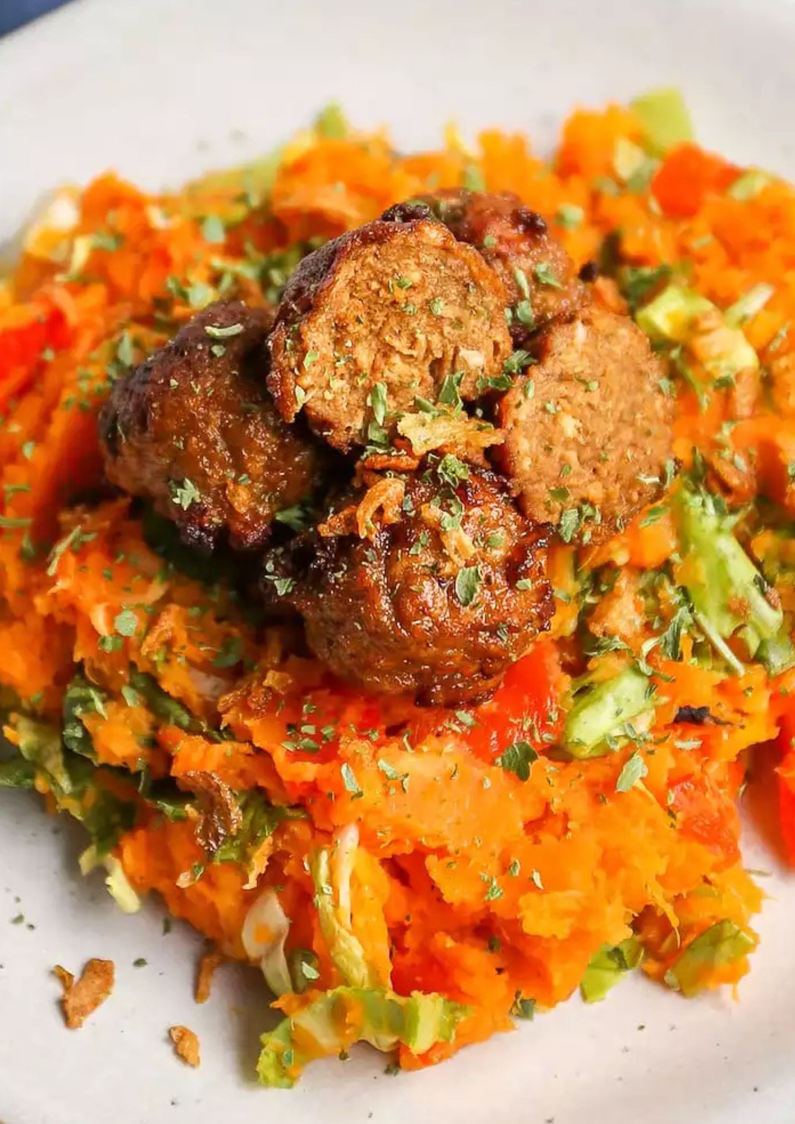 Deze stamppot met zoete aardappel en andijvie is een heerlijke en voedzame twist op de klassieke stamppot. De zoete smaak van de aardappel combineert perfect met de frisse andijvie, hartige vegetarische balletjes en de romige kaas. De gegrilde paprika voegt een extra smaakdimensie toe, terwijl de gebakken uitjes zorgen voor een knapperige topping.
